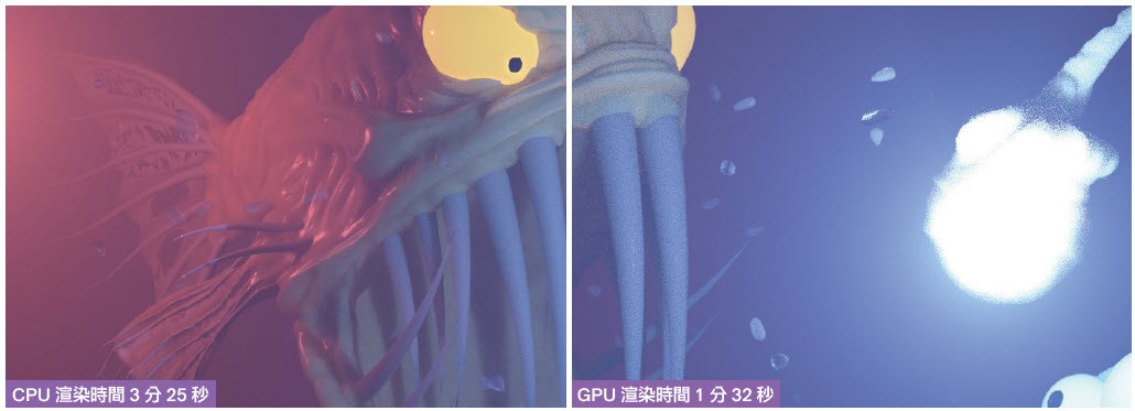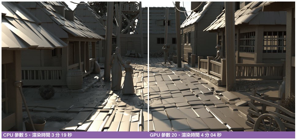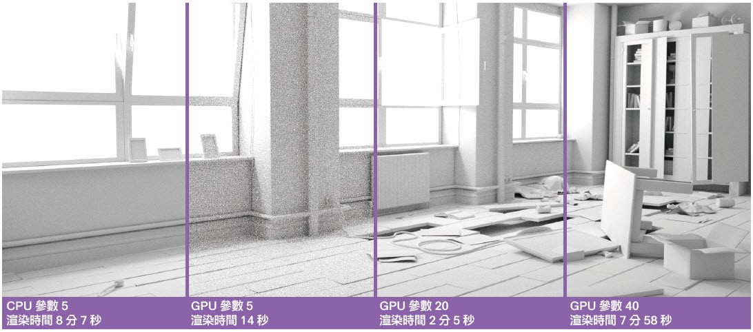 這個場景面數為 233,442,使用三盞點光源,分別測試 CPU與 GPU 渲染速度與效果,參數完全不作任何更動。計算結果CPU 時間為 3 分 25 秒,GPU為 1 分 32 秒,但是從圖像品質研判,雖然 GPU 完成速度較快,但品質並沒有在同一個水平上,顯然 GPU 在算圖品質參數上必須做出調整,才能與 CPU達到同一個水準。
