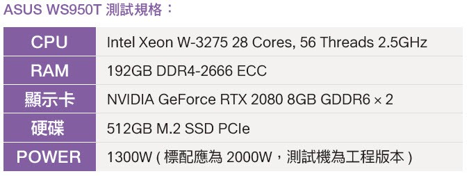 這次小編拿到的 ASUS WS950T ,CPU 配置了 Intel Xeon W-3275 28 Cores, 56 Threads 2.5GHz 極致渦輪加速 (Intel Turbo Boost Max Technology 3.0)可到 4.6GHz,記憶體 192GB DDR4-2666 ECC,512GB M.2 SSD PCIe, NVIDIA GeForce RTX 2080 8GB GDDR6 兩張與 1300W 80 Plus 電源供應器( 標配應為 2000W,測試機為工程版本 )。想要同時支撐 CPU 與 4 GPU 全速運轉所需電力,2000W 等級電源供應器絕對是必要而非選配。雖然說 ASUS WS950T 是以單 CPU 駕馭 4 GPU 設計方式,但並不代表 CPU 運算效能就如雞肋般存在,這顆 intel Xeon W-3275 運算效能也屬於傳說等級,能實地測試也算小編蒙主厚愛、三生有幸才能一睹風采,接下來就來實際測試看看。