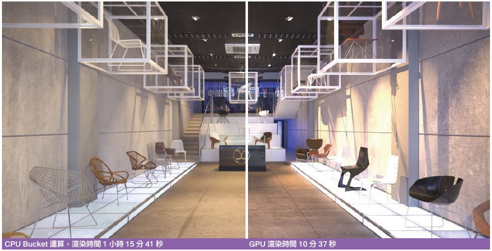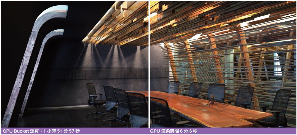 這個場景面數為2,945,601,場景設定室會議室空間,使用了 135 盞燈光進行照明,光線彈跳次數非常多,可以充分展現運算效能,採用與場景一一樣的測試步驟,計算結果 CPU 計算時間為 1 小時51 分 57 秒,兩種方式結果差不多,而 GPU 運算結果更令人驚訝,僅需要 1/18(6分 6 秒 ) 的時間就渲染完成,對於業界愛好 V-Ray使用者來說,若不切換成GPU 渲染引擎,競圖時間將遠遠落後對手。