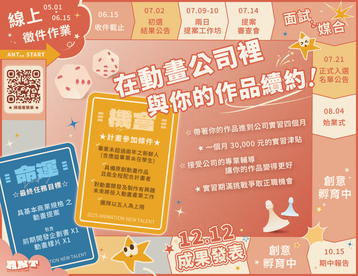 台灣動畫人才向來不缺創意,缺的是一條能走下去的路。本計畫鎖定應屆畢業作品與尚未商業化的原創畢業製作,媒合新秀團隊與動畫公司提供技術指導、實務協助與開發資源,讓創作者不再單打獨鬥。入選團隊將獲得每人每月 30,000 元的實習津貼,進駐台灣實力在線的動畫公司四個月,與業界共同優化作品、打造完整商業提案、進行原創再造。未來,更有機會將孵化後的作品推向補助、投資與影展,最終走向國際,強化臺灣原創市場量能。