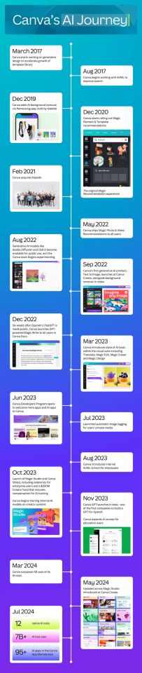 根據 Canva 自家所調查的《視覺經濟報告》與《市場行銷與 AI 報告》指出,大眾對於高效率、高品質的視覺需求日漸增加,且 AI 在工作生產力與創造力中,扮演著越來越重要的角色。以市場行銷面來說,團隊可利用 AI 瞬間生成針對特定受眾的廣告創意;而設計師則能用來創建視覺初稿,使工作流程更加完善;創意人員可將概念視覺化,以利與客戶之間的溝通。而撇除本次收購案,這幾年來 Canva 也陸續以各種方法進行投資,並成功開發了許多 AI 功能,包括 2019 年推出的背景移除工具、收購 AI 視覺公司 Kaleido 而推出的文字轉圖片的工具、2023 年亮相的首款全 AI 驅動產品 Magic Studio 等等,都是顯而易見的例子。