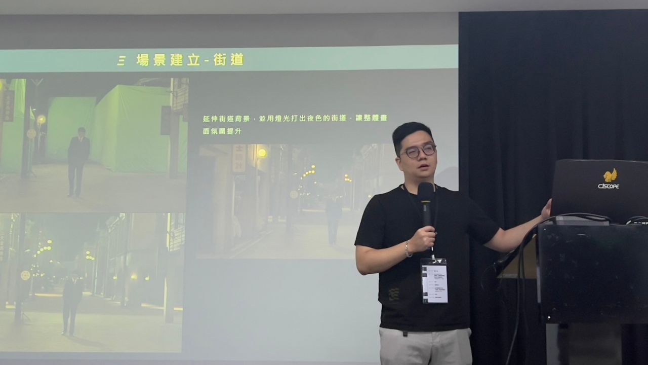 罡風創意映像 CG 總監曾彥偉,參與過各種電影、影集等幕後製作。在講座中特別解析《商魂》的場景、交通工具、人物的建立。《商魂》中每個建築物細節都是精心考究與設計,房子的紅磚牆、水泥結構、門的木紋設計,每個瓦片髒污變化,讓這些建築細節看起更符合現實。其中一景,中華水泥大樓實拍只有兩層樓,罡風創意額外製作了三到四層樓讓整體看起來更雄偉。還有一個看似簡單的招牌置換,由於這是一鏡到底的運鏡,需要花更多的心力去追蹤。然而,大部分的 CG 呈現,為了加強建築實景的空間感,讓街景變得更深邃。