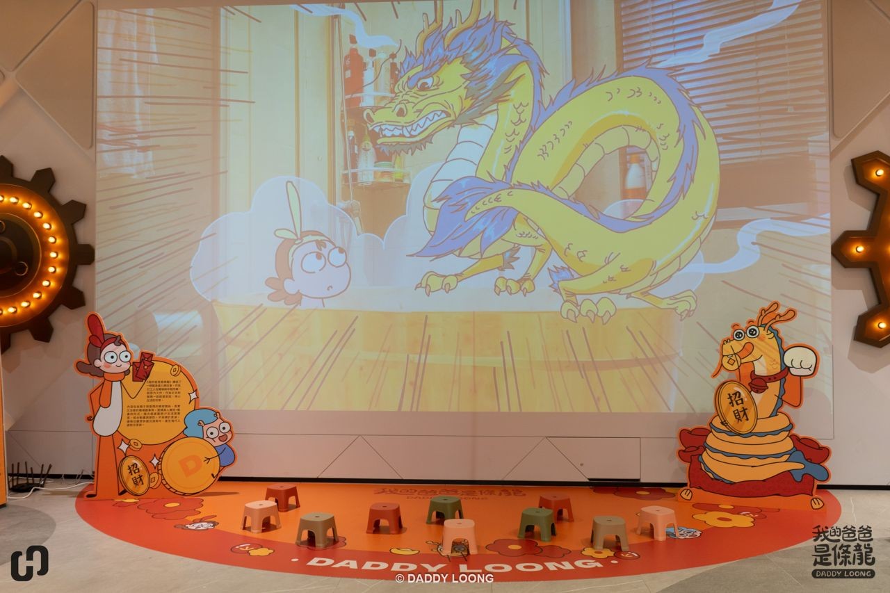 如果平常只能在手機、平板小螢幕或筆電上觀賞「我的爸爸是條龍」系列動畫,本次快閃店特別打造大型投影布幕的室內電影院,讓龍爸一家動畫直接以投影大布幕呈現,搭配上可愛彩色小板凳,招財龍爸邀請您一起體驗久違地放鬆慵懶,開心地觀賞歡樂的龍爸家動畫,一起被逗得哈哈大笑,享受悠閒愉快時光。