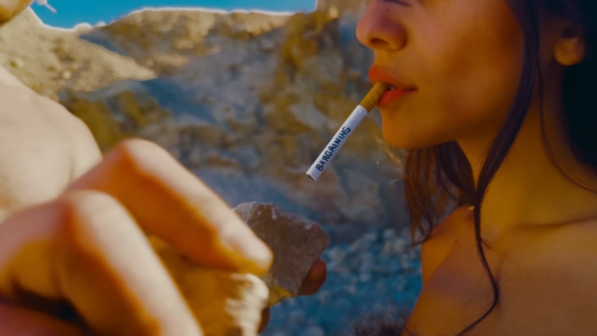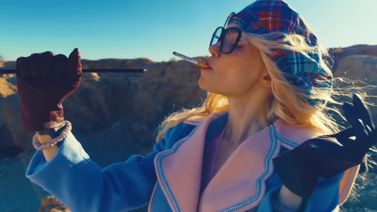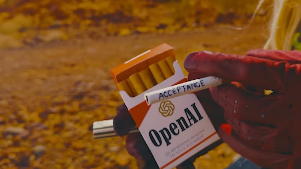 〈人造天使〉中,藏著大量對 AI 浪潮的致敬。其中一項線索,是印有 OpenAI 商標的萬寶路香菸。Grimes 用香菸來譬喻 AI、將萬寶路替換成 OpenAI,以及不時閃現的 Sora AI 影片浮水印,來類比吸菸這樣「明知有害,卻無法停止」的行為,正是諷刺著人類對 AI 的上癮、焦慮、依賴與自我毀滅。