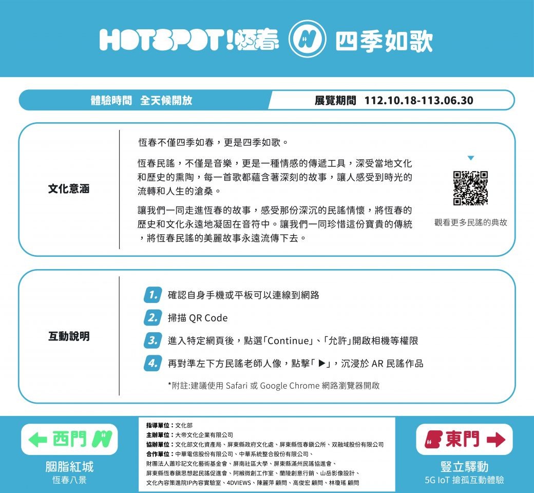 在文化部-地方場域導入藝文創新服務示範計畫下,中華電信憑藉優秀的技術力,全面優化當地5G行動網路訊號,並攜手互動科技製作商愛迪斯科技,在東南西北四座古城門區建置地方藝文相關的數位應用,打造「HOTSPOT!恆春」展演活動,並隨著屏東縣政府每年在恆春鎮的重要文化祭典「半島世界歌謠祭」盛大展開。