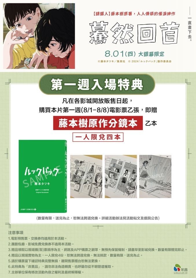 這部由《鏈鋸人》作者藤本樹打造的短篇漫畫神作《驀然回首》,在粉絲的殷切期盼下,終於製作成電影登上大銀幕,即將在 8 月 1 日(週四)於台灣盛大上映。片商也順勢公佈本片的「第一週入場特典」,只要在各影城開放販售日起,購買本片第一週(8/1-8/8)電影票乙張,即贈送遠從日本原裝空運來台的「藤本樹原作分鏡本」乙本。尤其這是非常珍貴的特典品項,一人限兌換四本,數量有限,送完為止。本片劇情描述擅長創作四格漫畫的小四生藤野(吉田美月喜配音),意外得知長期「家裡蹲」拒絕上學的京本(河合優實配音),也跟她一起在校刊上連載四格漫畫。在藤野眼中,京本的畫功優異於她,讓藤野在自尊心作祟下,將其轉化成自己的成長動力,卯足全力鑽研畫功,花費一整年時間試圖追上差距,卻自認仍舊無法超越京本,導致她心灰冷意,決定放棄繪畫。直到小學畢業前夕,藤野在老師的請託下,轉交畢業證書給待在家中的京本。兩個性格相反的少女,也在此時正式相會,不僅促使藤野重燃對漫畫的熱愛,更牽起兩人不可分割的羈絆,共同踏上創作之路。隨著歲月流逝,兩人的逐夢之路有悲有喜,然而一場殘酷的意外,卻粉碎了她們對未來的一切幻想…。欲知本片最新消息,請上電影官方臉書粉絲團與 Instagram 專頁查詢。