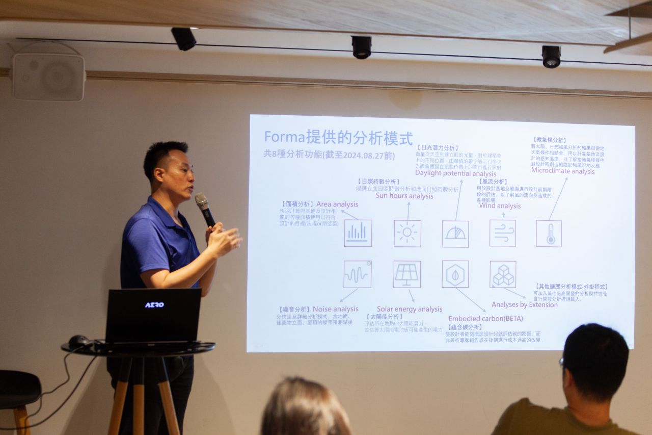 活動下半場則是由傅邦鈞講師所帶來的 Autodesk Forma x BIM 介紹,他近年致力於推廣節能減碳以及建築物碳排的結合應用,因此開場首先帶到了台灣的「2050 淨零」計畫。他表示國家發展委員會正藉由建築、運輸、工業、電力、負碳技術等五大層面來實現此目標,包括不興建燃煤電廠、提高電動公車普及率、使用再生能源發電等等。其中,建築方面除了需提高建築能效之外,更要降低「OC」與「EC」,並搭配國際綠建築 LEED v4 評估認證與 BIM 來設計建物,例如位置、永續性、材料、用水效率等等,以達到更佳的減碳效果。