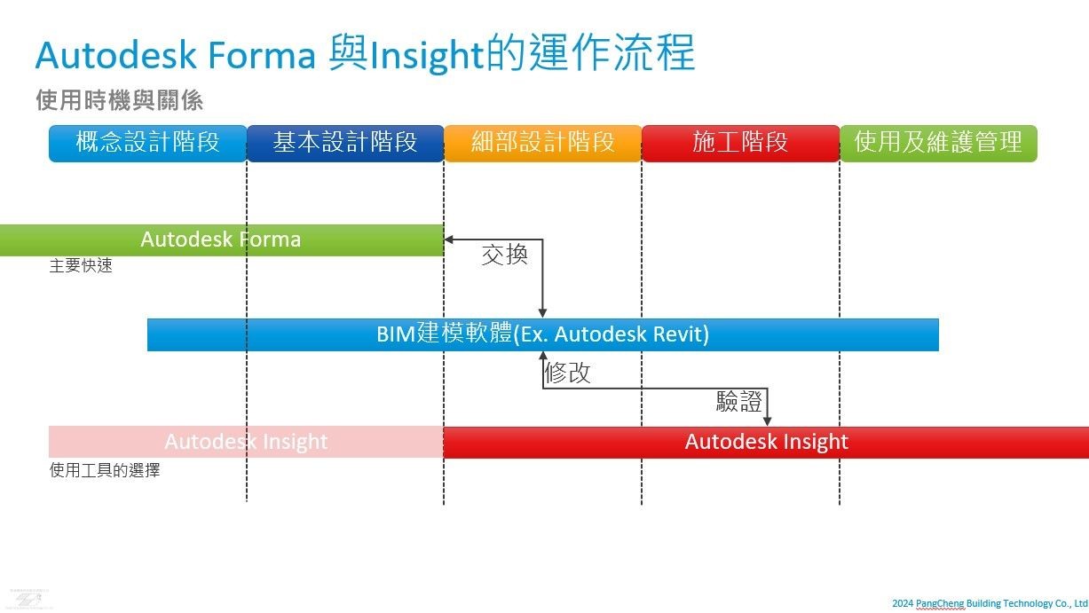 邁入設計中後期階段,此時已透過 Revit 生成 BIM 與空間模型,我們便能透過 Autodesk Insight 來進行驗證。「它也是一款性能分析工具,但相比 Forma 更注重於能源效率、環境影響、OC/QC 評估和可持續性等方面,從而優化建築後期設計與性能。」,邦鈞說道。他表示,儘管大多建築團隊皆遵循初期用 Forma 做概念設計、中期用 Revit 建立 BIM ,後期用 Insight 驗證的方式進行,但偶爾也有一些特例專案,在前期就會用 Insight 來構思概念設計。活動尾聲,他呼籲即便 Forma 可在前期生成許多分析參考資料,但仍需經過整理及轉化,才能為相關的指標申請書所用;且在 Revit 裡建置完 BIM 後也需注意建築物的座標與地理位置等資訊是否正確,才能在細節與效率上取得平衡。