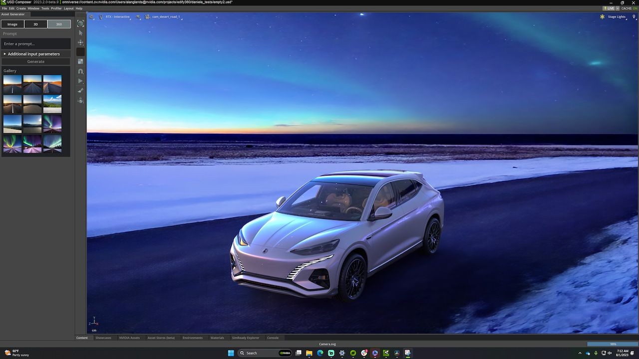 過去藝術家要購買昂貴的 360 度攝影機,從頭開始建立背景和環境貼圖,或者要從可能無法精確匹配其 3D 場景的固定選項中來選擇。現在,使用者只需提供提示,無論是文字還是參考圖片,基於 Picasso 的 360 HDRi 服務將能夠快速生成全景圖像。此外,由於生成式人工智慧的幫助,,自訂環境貼圖可以自動匹配合經提示輸入生成的背景圖片。用戶接著可以自訂貼圖,快速反覆調整修改各種想法,直到出現他們想要的畫面。