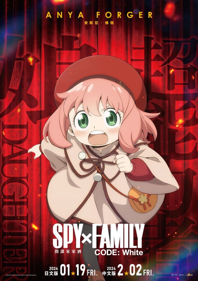 席捲全球的現象級超人氣動畫「SPY×FAMILY間諜家家酒」推出全新原創故事劇場版「SPY x FAMILY CODE: White」日文版確定於 1 月 19 日躍上全台大銀幕,而2月2日也會推出中文配音版本,超高規格製作讓人氣超高的安妮亞在大銀幕動起來,期望可以衝破動畫票房新高,快來與地表最強家庭「佛傑一家」破解任務守護世界和平!