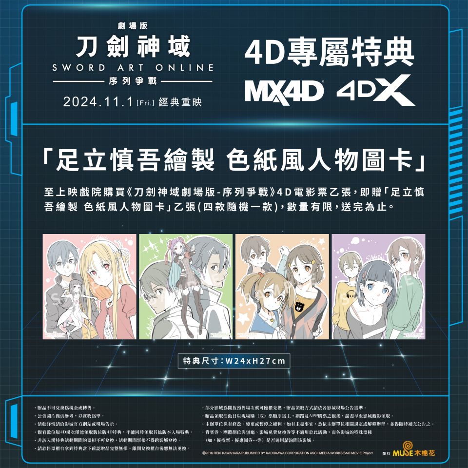 木這次經典重映的劇場版特典更是不容錯過!上映第一週的 2D 特典「A3 電影主視覺海報」為這次重映限定的海報,特別選用厚磅紙質絕對值得鐵粉收藏。而 4D 專屬特典則是由 SAO 動畫系列總作畫監督兼角色設計──足立慎吾所繪製的「色紙風人物圖卡」,尺寸有 24 公分(寬)× 27 公分(高),由日本授權台灣印製,也是七年前日本上映時曾贈送的日本特典,款式共 4 款,以隨機贈送1款的方式發送,極具紀念價值!特典皆是數量有限,贈完為止,想收藏的粉絲記得 11 月 1 日進戲院一同重溫感動!