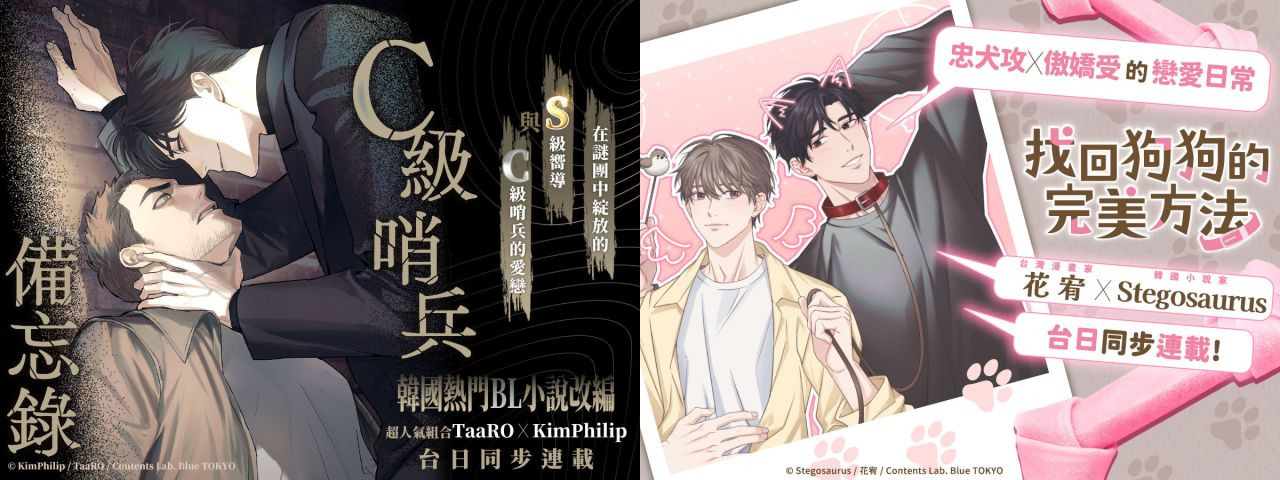 臺灣漫畫搶佔日本線上平臺!文化內容策進院(文策院)與韓國條漫製作公司 Contents Lab. Blue TOKYO(CLB) 合作,由兩位臺灣漫畫家花宥、TaaRO 改編韓國人氣 BL 小說原著所創作的條漫《找回狗狗的完美方法》和《C 級哨兵備忘錄》,自 4 月 28 日起已在文策院《CCC 追漫台》以及 コミックシーモア、BookLive、Piccoma 等十個日本線上閱覽平臺上架連載,將粉絲們心中糖度爆表的小說情節以細緻的漫畫呈現。