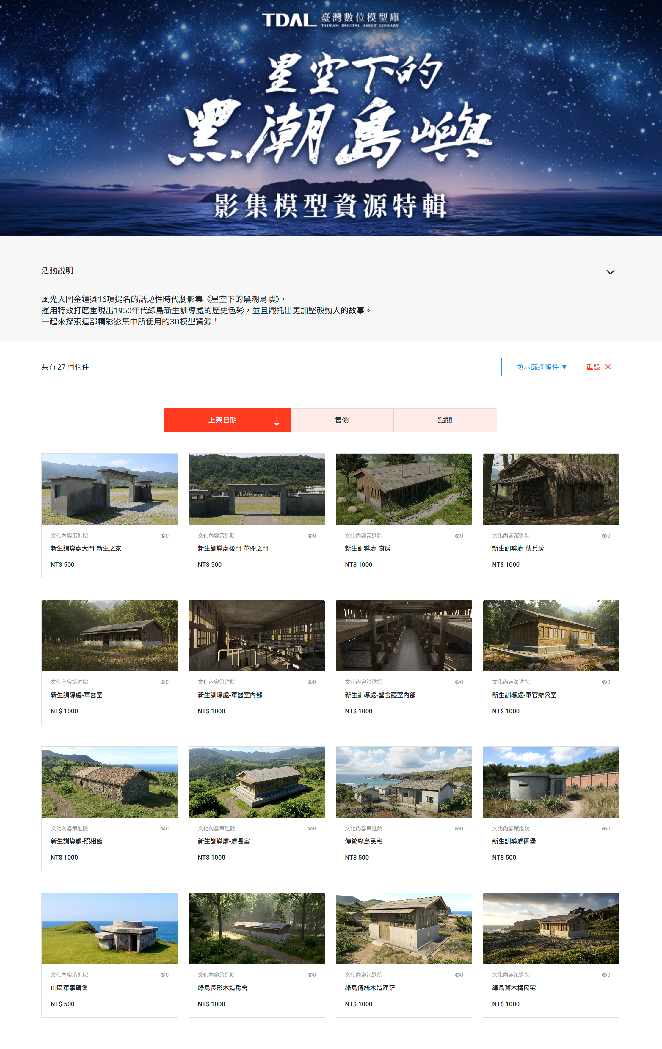 TDAL 也會定期收錄臺灣影視作品中的模型。如入圍多項金鐘獎獎項的電視劇集《星空下的黑潮島嶼》,參與製作的夢想動畫為了還原 1950 年代的時空背景,透過 3D 建模重現過去尚未開發的綠島海岸景觀,以及當時為了感化政治犯的「新生訓導處」,模型包含營舍中的軍醫室、碉堡、伙兵房等各式場景。