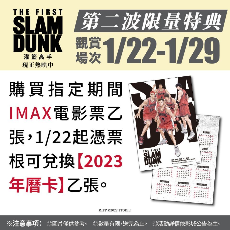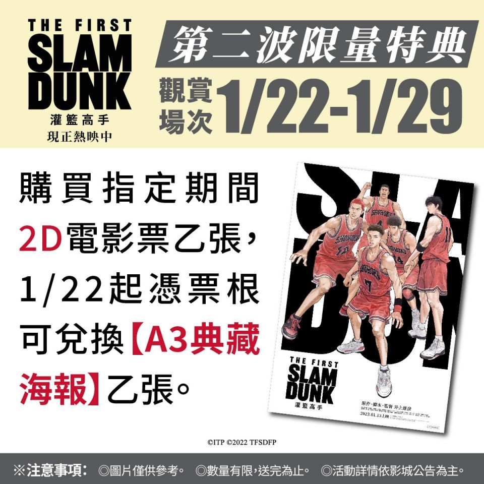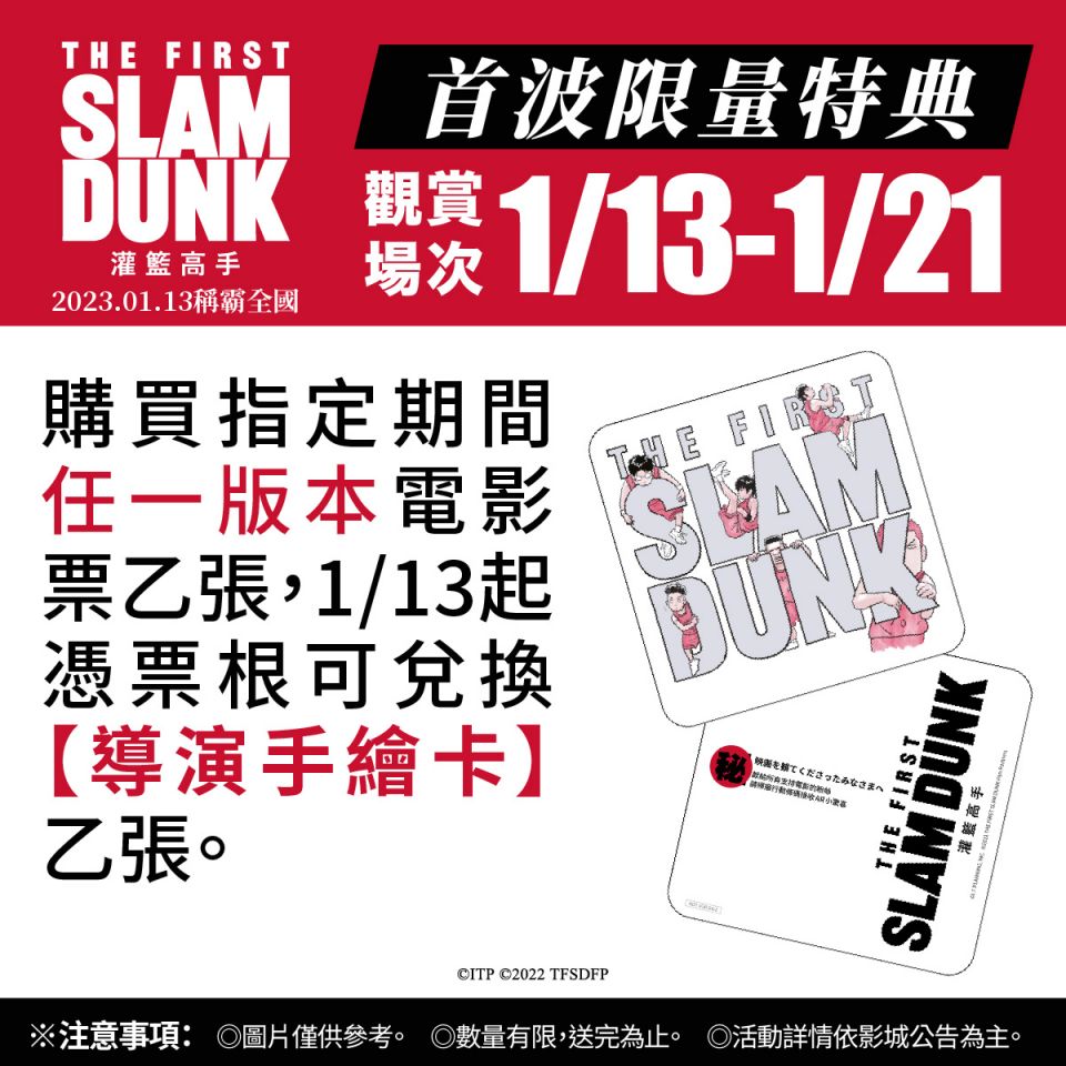 經過 26 年的等待,發行商台北双喜電影也積極爭取粉絲福利,《灌籃高手 The First Slam Dunk》首波限量特典,將獻上原作井上雄彥「導演手繪卡」,這是作者為了回饋全球粉絲,讓動漫迷在電影首週上映時,都有機會拿到入場特典,凡在指定期間購買任一版本電影票乙張,1 月 13 日起憑票根即可兌換,該手繪卡背面附有 QR code,手機掃描完畢,再掃卡片將會出現 AR 動畫。第二波限量特典:凡在指定期間購買 2D 電影票乙張,1 月 22 日起憑票根可兌換「A3 典藏海報」,為了「原汁原味」呈現井上雄彥的手稿質感,特別選用繪畫紙質來製作,絕對值得粉絲收藏裱框;購買 IMAX 電影票乙張,則可憑票根兌換「2023 年曆卡」。觀看 IMAX 電影版,還有機會加購「日本原裝進口電影場刊」。