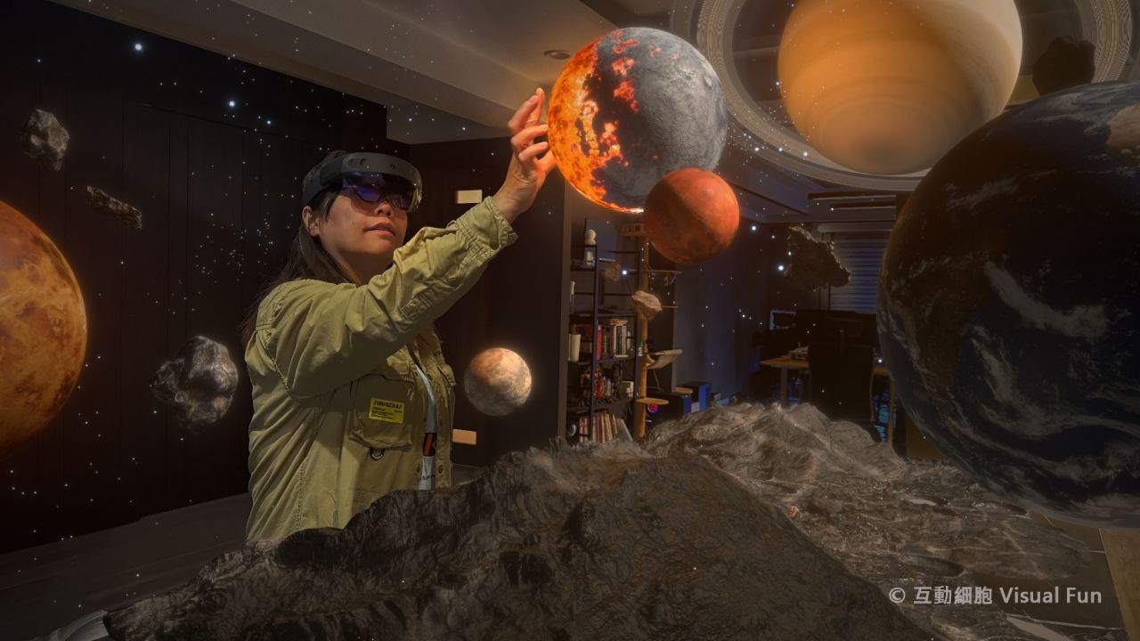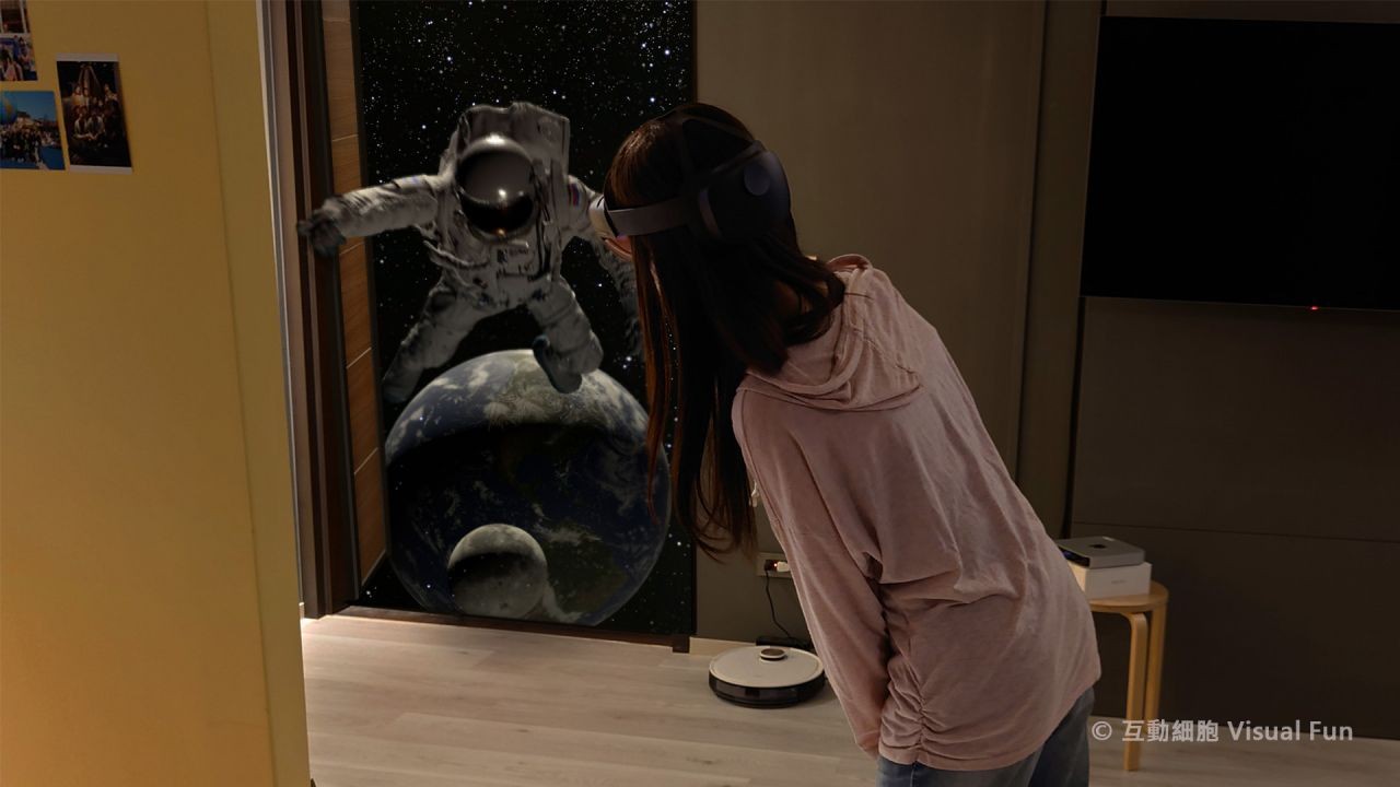 記者實地親臨「互動細胞 Visual Fun」,戴上 MR 眼鏡,映入眼簾的是宛如科幻電影的宇宙場景出現在門口,虛擬場景完美貼合真實世界。接著一顆隕石從眼前飛過,搭配具有方向性的音效,極高的真實度讓記者忍不住閃避,然而記者看到的畫面僅是 3D 特效。顏武雄透露,公司開發了精準的 MR 空間定位技術,可將虛擬空間貼緊真實環境,也開發多項 MR 關鍵技術,並拿到 AR 發明專利,讓觀者可以透過頭戴式裝置觀看電影等級的視覺效果,讓體驗大幅升級。再來,顏武雄提到公司最引以為傲的「虛實互動環節」,體驗者伸手即可碰觸虛擬空間的隕石,當實體的手進行捏與放開的動作時,隕石就在虛擬空間被丟出去。能做到如此流暢、連一點延遲都沒有的「虛實互動」,讓記者忍不住嘖嘖稱奇。顏武雄補充:「過往 VR 體驗,戴上全罩式頭戴式裝置,將觀眾抽離真實環境,進入虛擬世界與之互動,AR 體驗則是讓虛擬物件透過裝置添加真實環境,我們開發的 MR 體驗,則是要融合 VR 與 AR 的優點,既能夠在真實環境中看到虛擬背景與物件,還能夠與這些虛擬物件互動。」