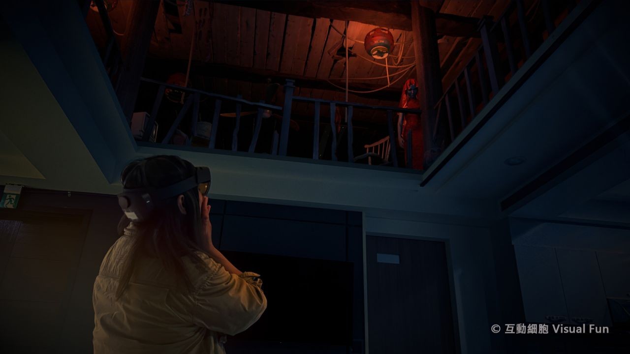 「互動細胞 Visual Fun」也讓記者體驗其他 MR 體驗,以鬼屋 MR 體驗為例,記者在桌上與牆壁上都能看到真實度極高的殘垣破壁,以及不時偷偷摸摸出現的女鬼,然而最讓記者嚇到的還是音效與動畫環節,顏武雄提到:「若要加強體驗,音效絕對是不可或缺的存在,公司研發一個獨特的聲音技術,讓人不用配戴耳機也能聽到具有方向感的聲響效果,讓人身歷其境。」順暢的角色動畫,也讓鬼屋體驗更為驚悚,比方說場景物件突然掉落,女鬼突如其來衝到觀者面前。顏武雄表示:「公司的技術幾乎可以實行高複雜度的角色動畫,因此只要有強大的 IP 與說故事的人才採用該技術,絕對會做出身歷其境的超真實體驗。」