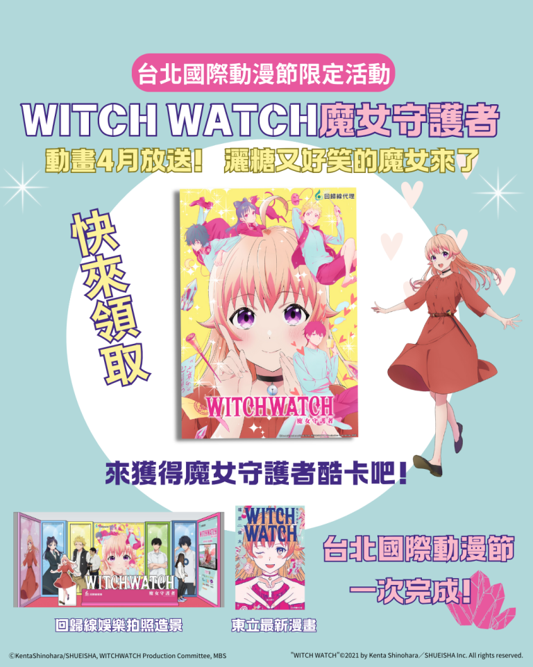 拍照場景更將首度於台北國際動漫節登場!活動於 2025 年 2 月 6 日至 2 月 10 日在南港展覽館一館,於回歸線娛樂攤位有大面主視覺圖與妮可主角群華麗排開,現場更有打卡獲得酷卡活動,一定要來玩!更多消息請關注「回歸線娛樂」,一起期待 2025 年 4 月《WITCH WATCH 魔女守護者》新一代魔法少女吧!