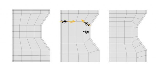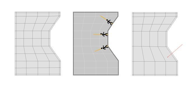 接著,我們原來的網格位於左側。然後,如中間所示,我們將移除不需要的邊緣,並修改與「重力流」不匹配的地方。然後,如右邊的例子所示,我們將把邊帶回中間區域,使所有佈線或多或少地再次均勻分佈。然後問題就解決了!雖然還有許多其他複雜結構,但我試圖讓他比較容易上手。