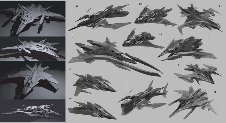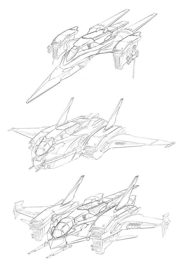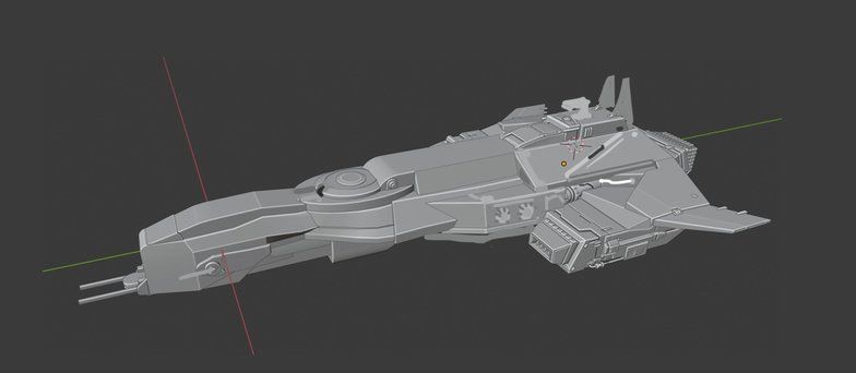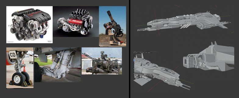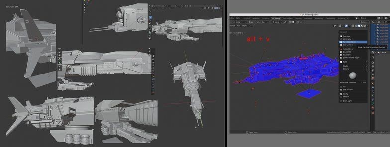 完成宇宙航母後,就開始進行宇宙飛船的設計。Samantha Kung 使用了另一種方法,從黑白草圖開始。透過不同解決方案以更快地得出新想法。由於它們只是 2D 圖形,為了看看它們在 3D 視窗中的外觀,在 Blender 中使用油性鉛筆,並根據草稿勾勒出形狀,稍微固定頂點並填充面。這不是一個俐落的模型,也不是最終模型,因此可以進行實驗、測試比例。