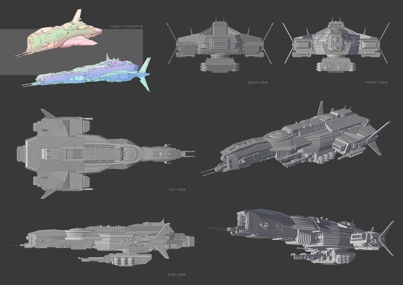這是基於草稿的最終概念。在宇宙航母上添加了一個模塊化的砲塔,有兩種不同的設計,可以在最終插圖中靈活地拆卸和組裝。至於材質,因為本次教學的飛船只使用了一種材質,並且沒有添加任何花俏的紋理,因為最終場景不需要它。