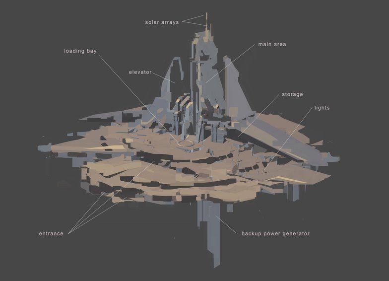 先畫出粗略的草圖來勾勒出想法。Samantha Kung 最初的想法是創建兩個級別,添加更多機庫以增加體積,並將主要區域放在中心以創建清晰的焦點。另外也添加了一些太空船的功能,如太陽能電池板、太陽能板、發電機等,使太空站設計看起來更實用。
