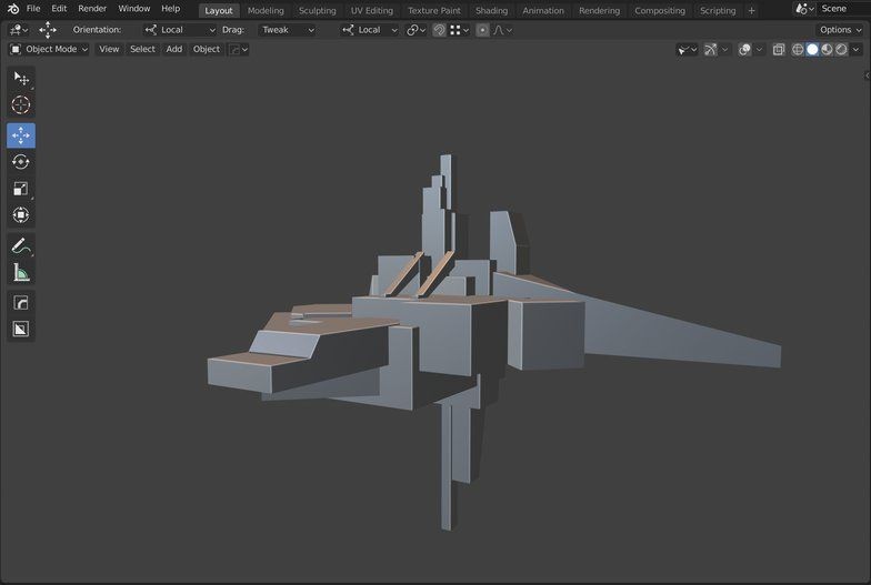 完成靈感設計後,開始在 Blender 中建模,固定整體高度和比例。這種建模非常具有挑戰性,因為它不是對稱的,必須考慮它在每個視圖中的外觀。每次插入新的幾何形狀時,我都需要考慮「大、中、小」的理論,避免重複,盡量讓它看起來有趣。