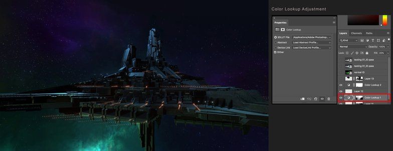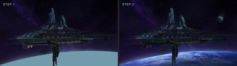 從「物件 ID」通道中刪除太空站後,在 Blender 外掛 Pro-Lighting:Skies 中搜索喜歡的太空背景,旋轉到適合繪圖的角度並修改設置。由於背景看起來太銳利,在 Photoshop 中用柔軟的紋理畫筆在周圍添加了一些霧氣,使顏色變得模糊,並在「顏色查詢調整 (Color Lookup Adjustment)」中調整了整體顏色。