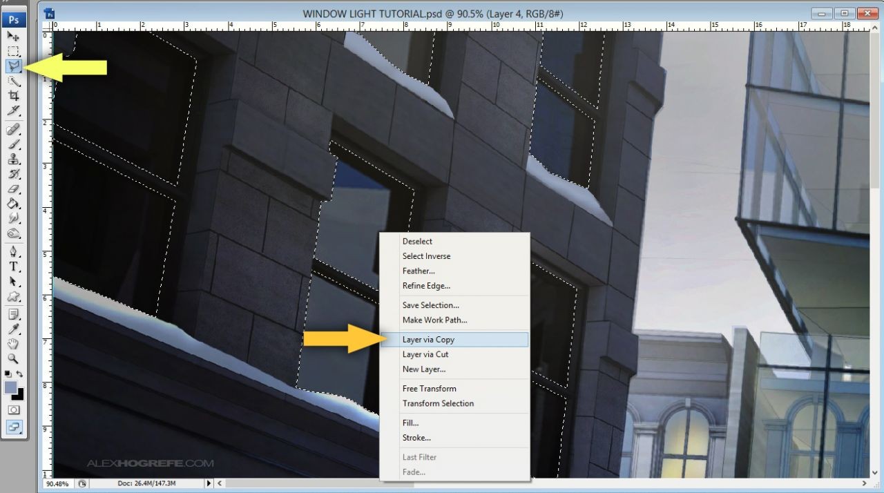 以上方的場景來說,我將建物身上的玻璃以很強的反射去運算。這讓我能將反射效果複製成獨立的圖層,然後在後續使用「Overlay」後製。要如何將它們複製到獨立圖層呢?選擇「Polygonal Tool」,然後選擇你試著打光的窗戶玻璃。右鍵選擇「Layer via Copy」。