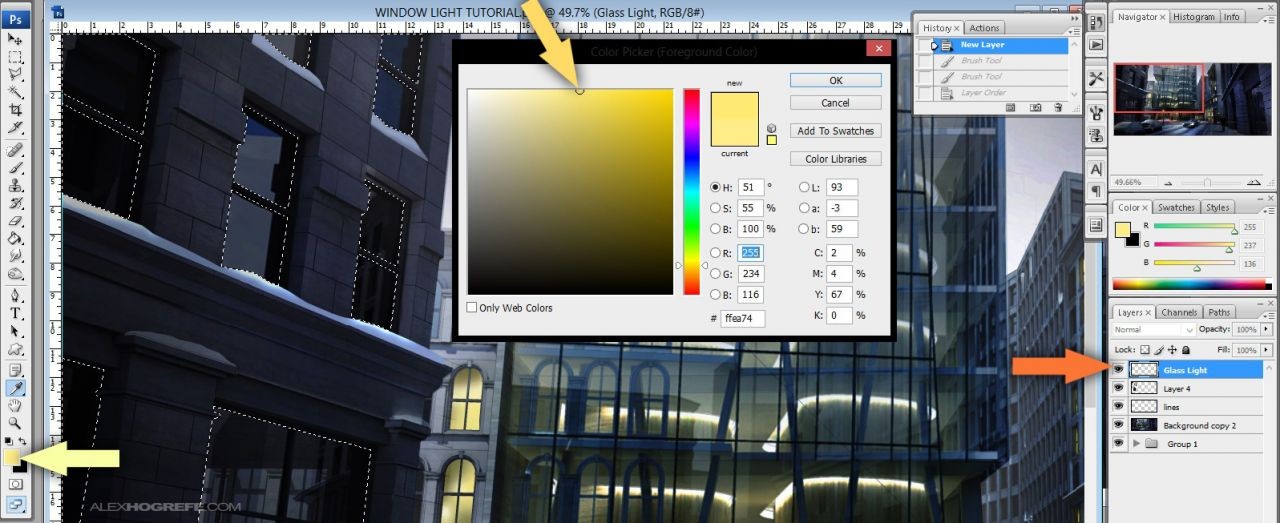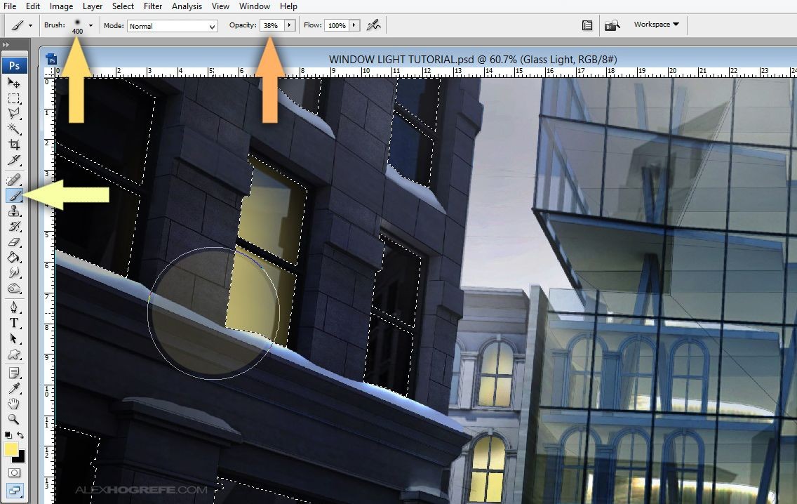 接下來,我新增新的圖層,命名為「Glass light」。同樣的,我再次選取玻璃的範圍。為了加快速度,你可以按下 Ctrl 並點擊剛才複製的反射圖層,當全部選取後,選擇「筆刷」工具,選擇黃色以及「Soft Round」的筆刷,然後降低筆刷透明度大約 15%。開始在窗戶的下緣開始往上畫,刷出淡淡的黃色漸層效果。