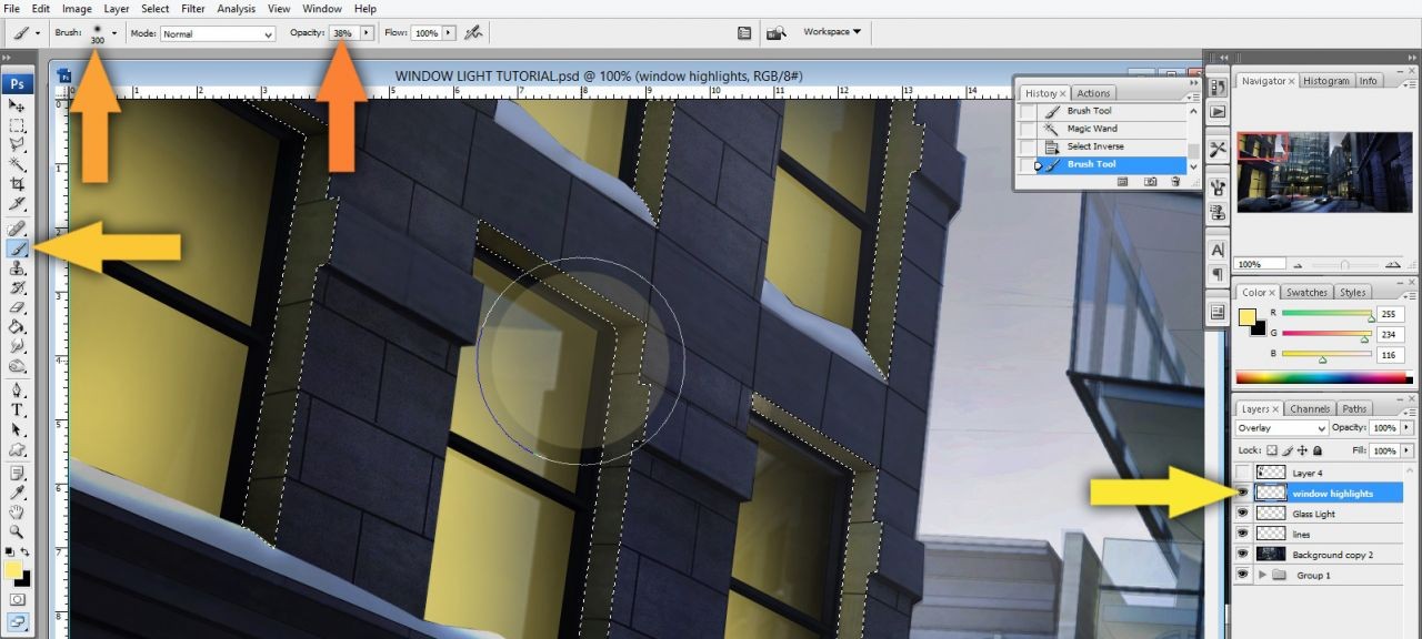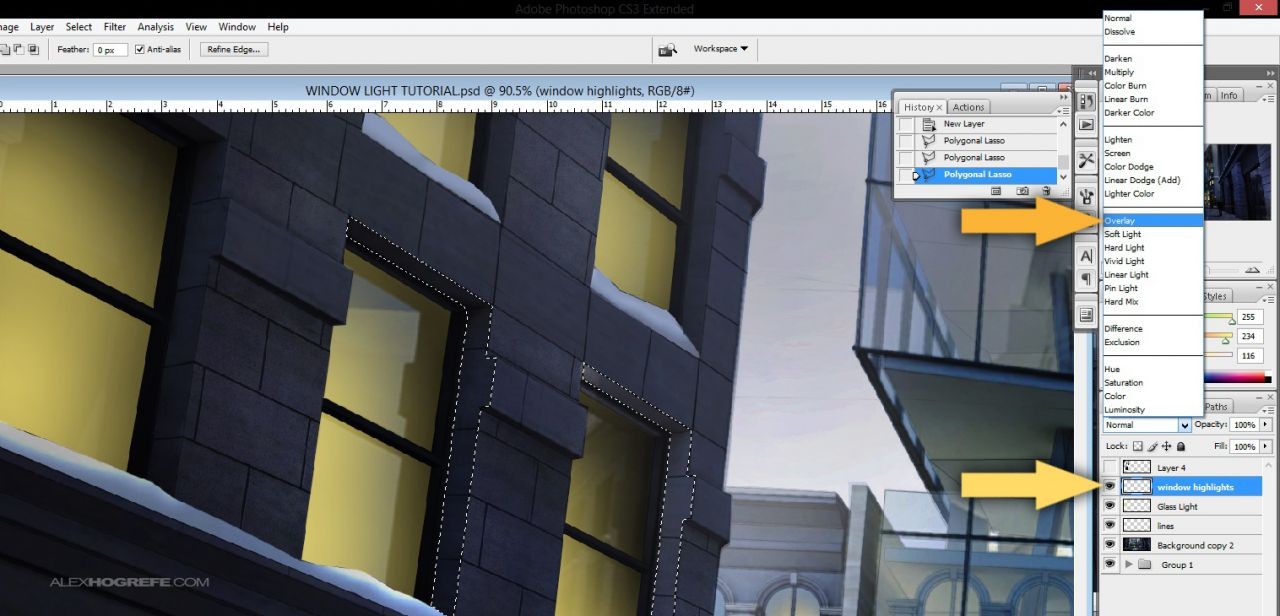 接下來這個步驟是很容易遺忘或是不太重視。事實上,它是在做後製光線中最重要的步驟。沒有了它,光線看起來會很不立體。一切都從新增一個圖層開始,然後將圖層的混合模式改為「Overlay」。然後只選擇窗戶立面的牆面厚度,那些室內燈光會照射到的範圍,通常就是與玻璃呈現 90 度的表面。選取之後,選擇「筆刷」工具,黃色柔軟的筆刷,將透明度設到 35%。接下來開始繪製光澤。如果光澤看起來很弱,你可以把圖層多複製幾層來加強其效果。
