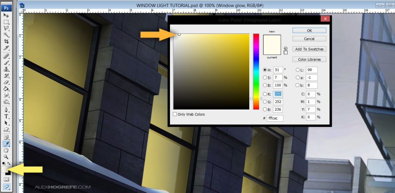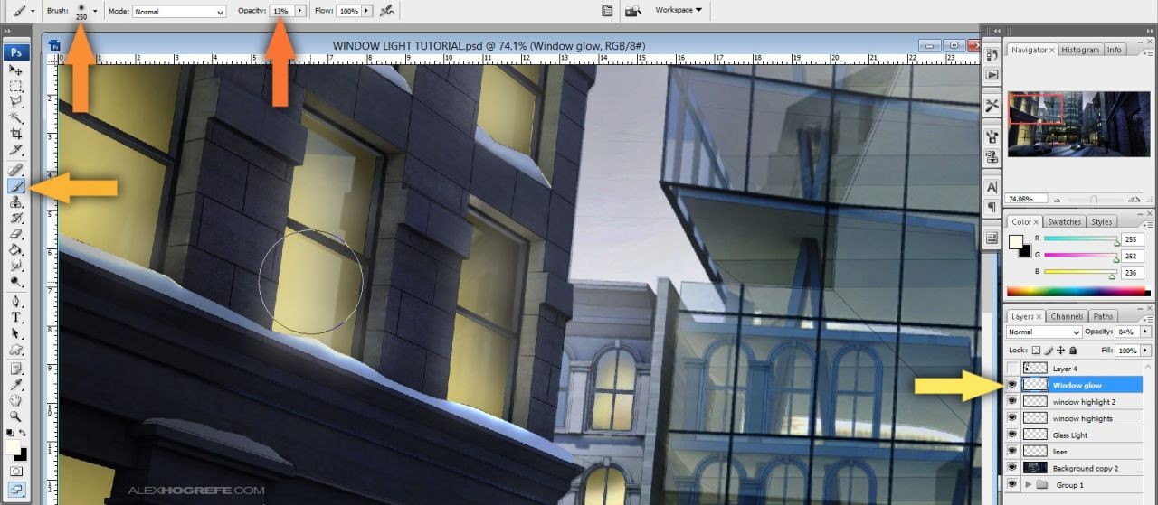 這也是另一個細微但也很重要的步驟。新增新圖層,然後選擇接近白色的淡黃色。選擇「Paint」工具,一樣用圓型柔軟的筆刷,然後將透明度設到非常低,大約是 12% 至 15%。開始在窗戶的邊緣繪製,記住,不要畫得太超過。
