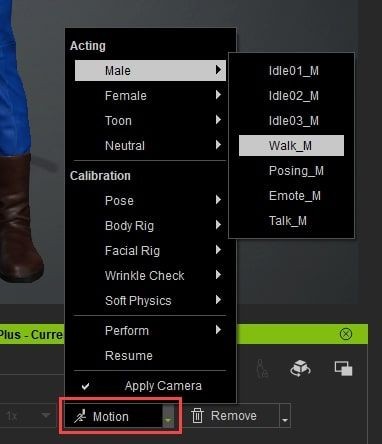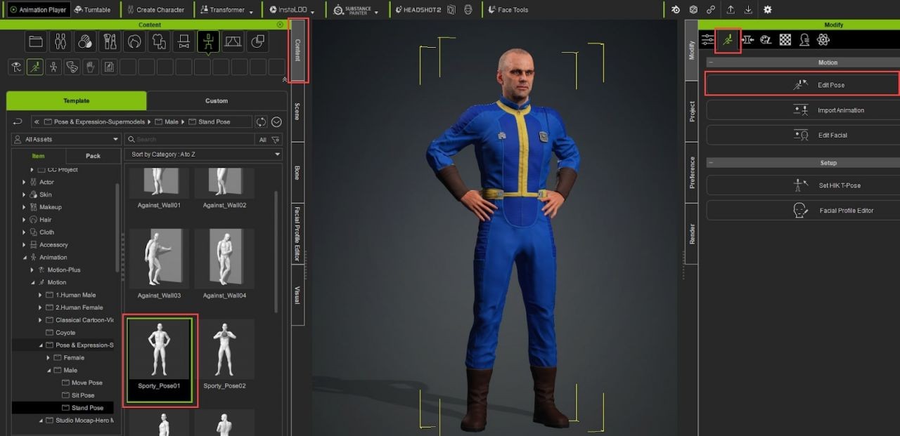 隨意從 Content Template 素材庫將姿勢或動態套用到您的角色。本例中,我要把 Sporty_Pose01 姿勢套用到角色,並使用 Motion Pose 頁籤中的 Edit Pose 按鈕對其進行微調: