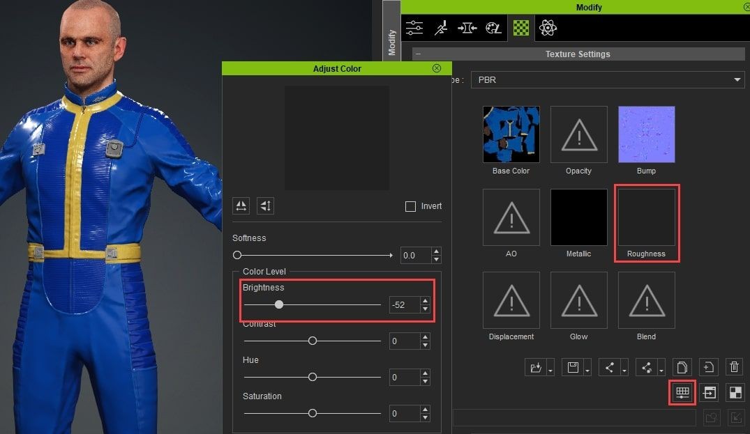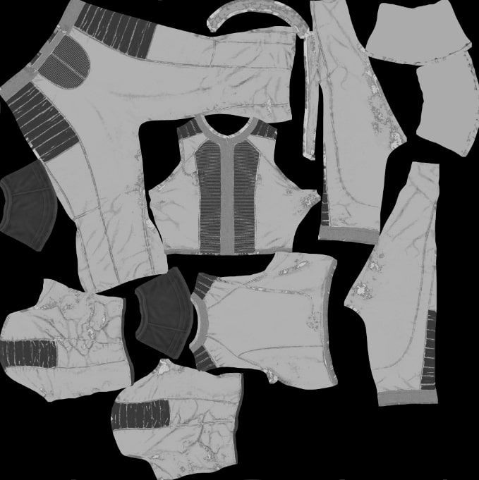 例如您可以對套裝粗糙度進行相同的操作;如果選取套裝,選取 Roughness 貼圖,我可以使灰色貼圖更暗(更閃亮)或更淡(更無光澤)。但是,如果我想讓衣服區域更無光澤,而橡膠區域更閃亮,該怎麼辦?