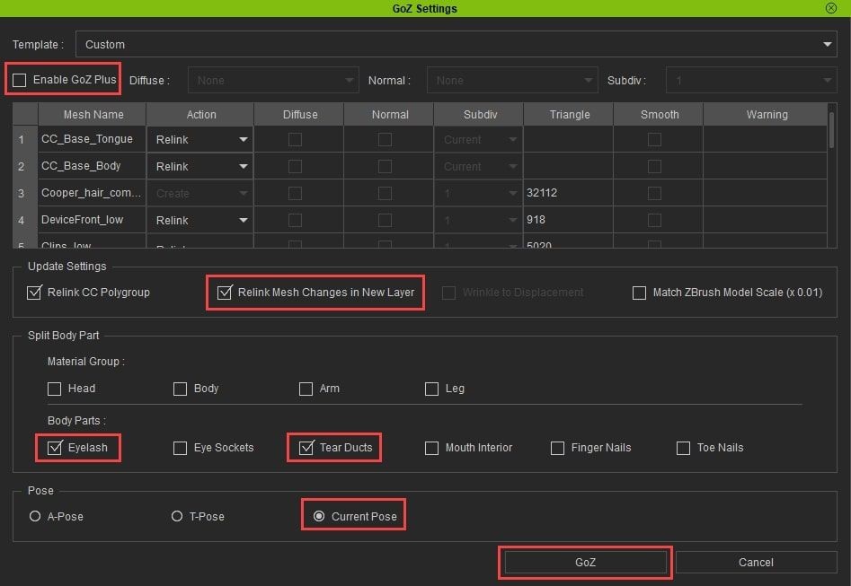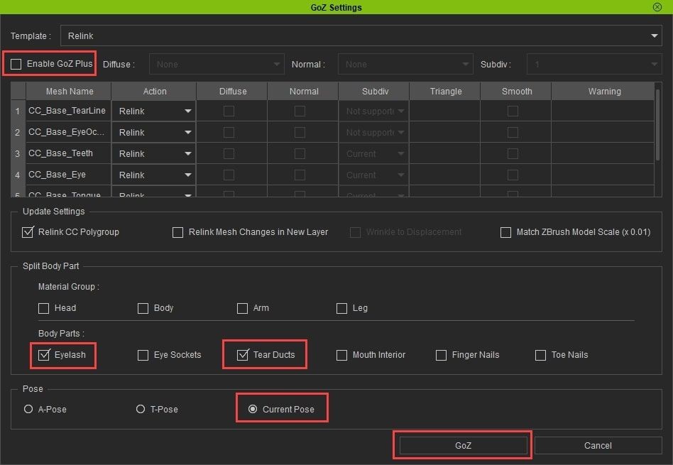 在 GoZ Settings 視窗中,我們將取消勾選 Enable GoZ Plus(我們不會將任何顏色或法線貼圖資訊焙刻回 ZBrush,只是移動 SDiv 1 頂點以符合我們的姿勢素材)。如果您想要將姿勢儲存為所有 Asset 子工具的圖層,請勾選 Relink Mesh Changes in New Layer。我們還會勾選 Eyelash 和 Tear Ducts,因為之前已將這些部位從基礎身體分離出來,我們想要與之相符。