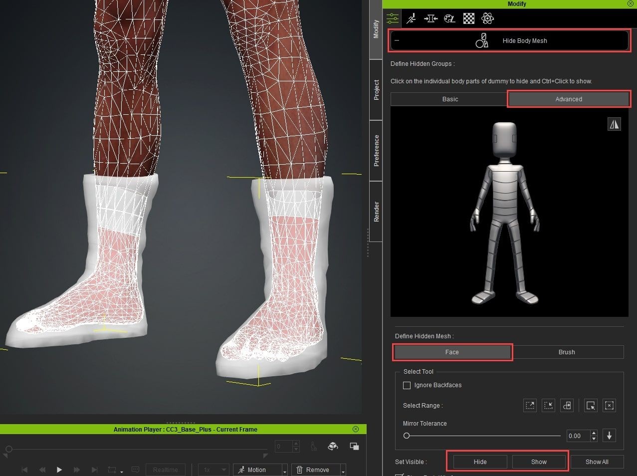 當穿著靴子和套裝的時候,不應該看到底層的人體多邊形,所以讓我們把它們藏起來。在 Scene 頁籤中選取套裝後,移至 Attribute 頁籤,然後按一下 Hide Body Mesh 按鈕。使用人體模型隱藏身體的主要部位,並透過表面選取進行微調。對靴子進行相同的處理。現在,每當將套裝或靴子套用到 CC 模型時,總會隱藏那些底層的基礎身體表面。請檢閱先前的 CC GoZ 一文,了解如何將服裝與配件儲存到自訂素材庫以供其他角色使用。