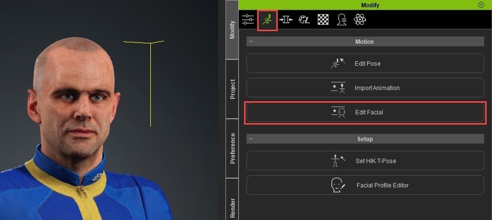 我們也可以變更臉部表情:按一下 Motion Pose 頁籤中的 Edit Facial 按鈕:
