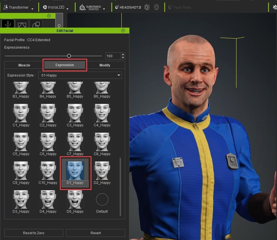 使用 Muscle、Expressions 或 Modify 頁籤為角色整入表情。