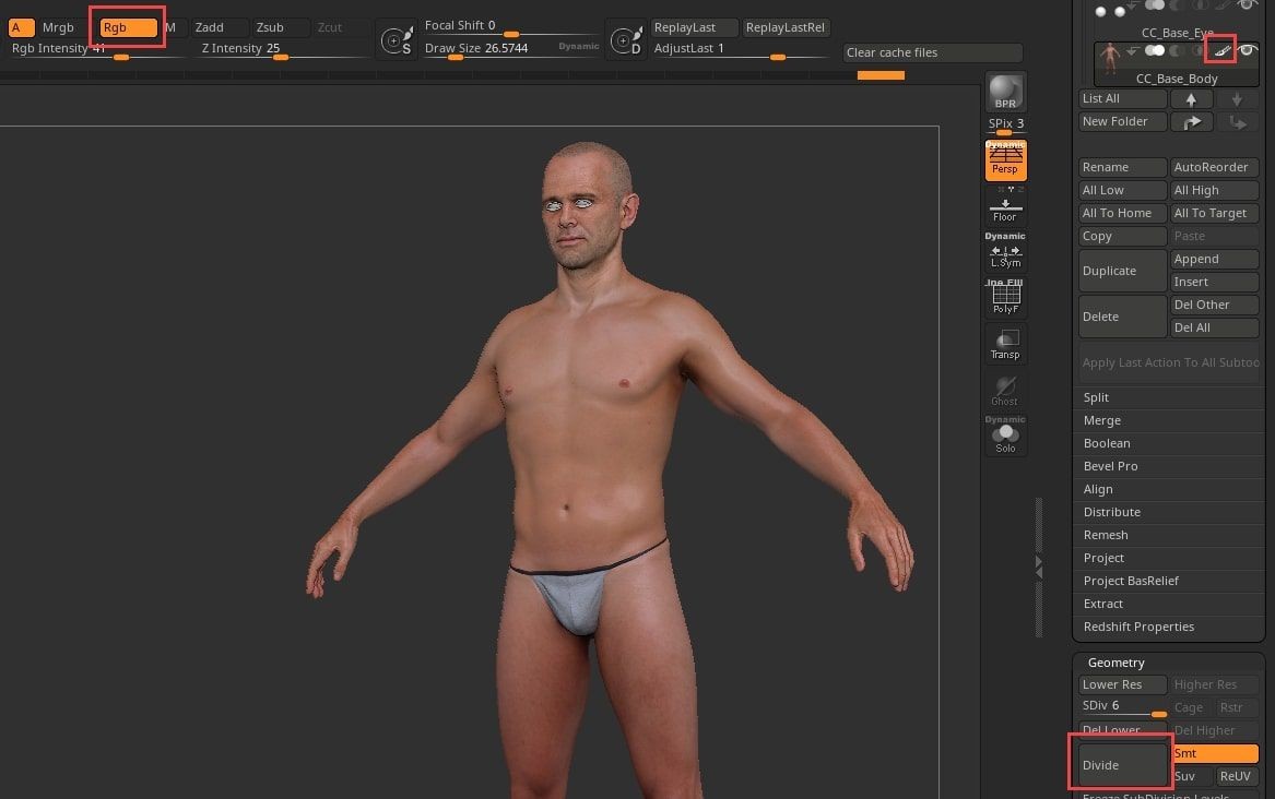 現在我們在 ZBrush 中可以微調角色,要取得更多詳細資訊,請移至 Tool > Geometry 選單並點擊 Divide 按鈕。視需要繼續微調雕刻並細分,直到做好完整詳細的雕刻。對於貼圖,啟用 CC_Base_Body 子工具的畫筆圖示以開啟著色,然後直接在模型上開始繪製(按鍵盤上的 B、P、A 以選取 Paint 筆刷,它只是 RGB 啟用、Zadd 關閉的標準筆刷)。如果您想知道如何取得如此精確的人體皮膚多邊形彩繪,我承認我只是從掃描資料傳輸了毛孔等級的細節和顏色並對其進行調整。不過,您可以使用任何啟用 RGB 的 ZBrush 筆刷隨意從頭開始繪製。
