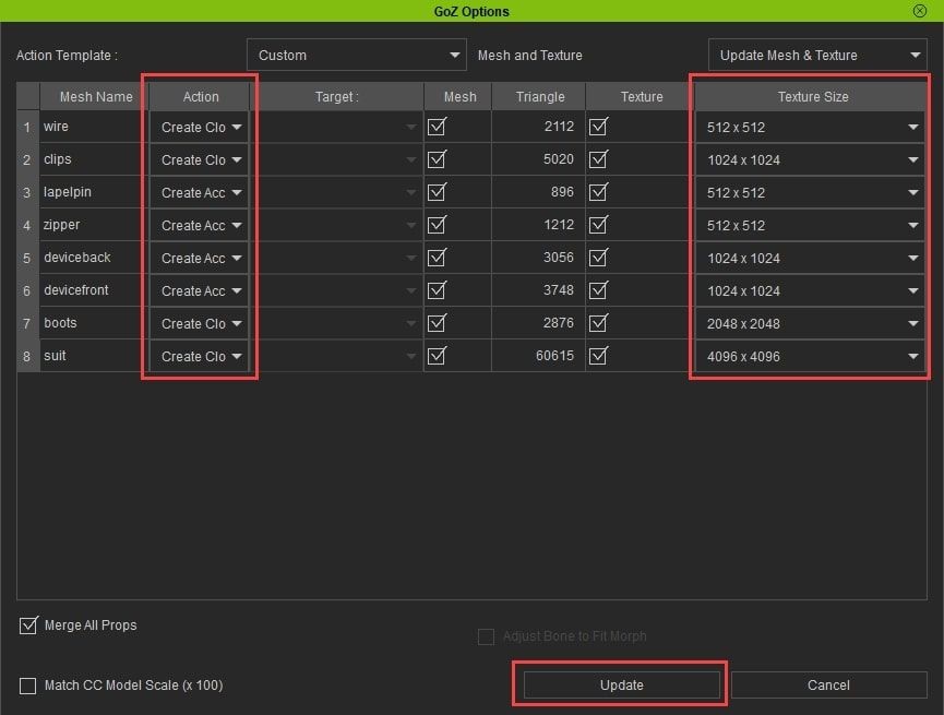 回到 CC,在 GoZ Options 視窗中,您可以選擇每件素材的貼圖大小,也可以選擇進來的物件是服裝、配件還是道具。如果物件在角色移動時會受到多個關節的影響(襯衫、褲子、靴子等),請選擇 Create Cloth;對於在移動過程中可以綁定到單一關節的物件(像徽章別針的硬表面物件),請選擇 Create Accessory。如果選擇了錯誤的選項,請不要擔心,您可以稍後在 CC 中將配件轉換為服裝物件,反之亦然。整入您的設定並點擊 Update 按鈕。