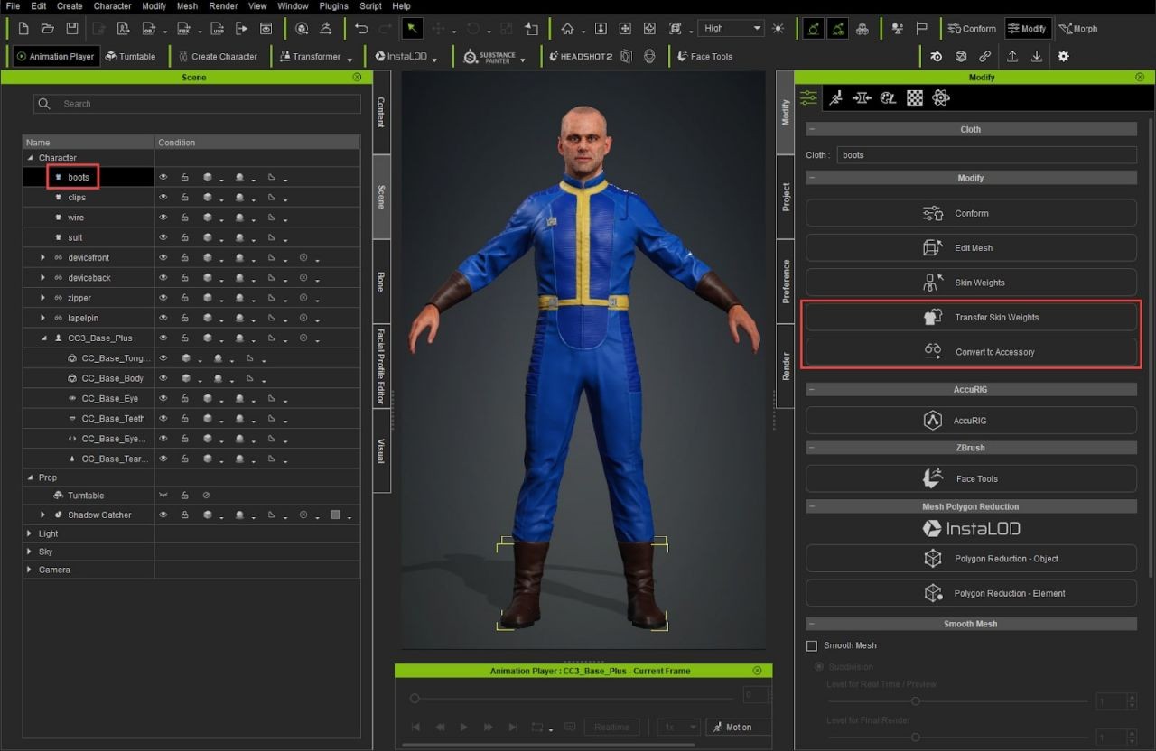 如果您改變該物件是配件或是服裝的想法,只要選取該物件並移至 Attribute 頁籤即可。選擇 Convert to Accessory 將先前的服裝項目轉換成配件,或選擇 Transfer Skin Weights 將配件轉換成將繼承身體蒙皮權重的服裝物件。