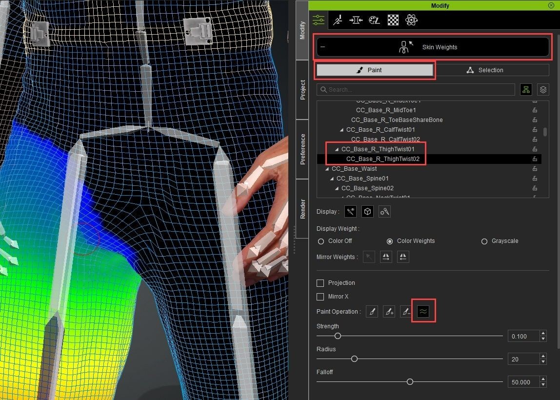 在 Scene 頁籤中選取套裝後,移至 Attribute 頁籤,然後按一下 Skin Weights 按鈕。選取 Paint 後,在問題區域後面的骨頭上按右鍵,然後選擇平滑筆刷。在此區域中繪製頂點,以平滑權重的效果,因為關節會影響網格面。本例中,ThighTwist01 和 02 的大腿權重都要進行平滑處理。再按一下 Skin Weights 按鈕,離開蒙皮權重模式。