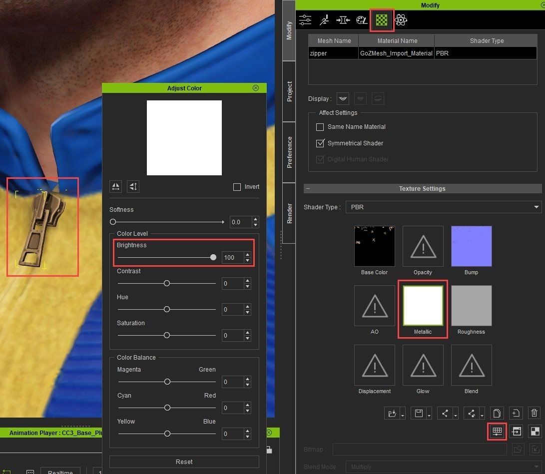 您可能會注意到金屬素材看起來不太金屬,所以在選取金屬配件後,需移至 Material 頁籤,選取 Metallic 貼圖,然後按一下 Adjust Color 按鈕。在 Adjust Color 選單中,您可以將亮度拉至 100,以便將貼圖從黑色(非金屬)轉換成白色(全金屬)。
