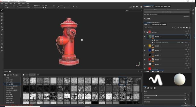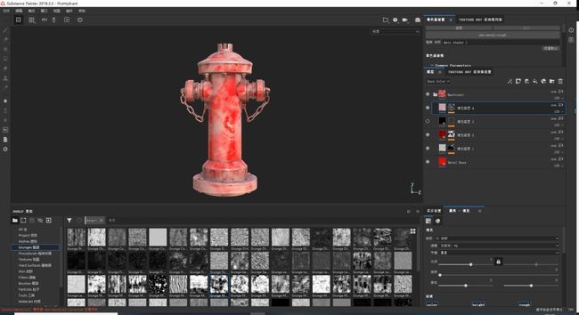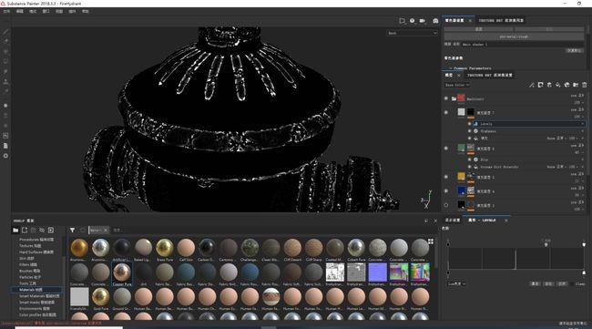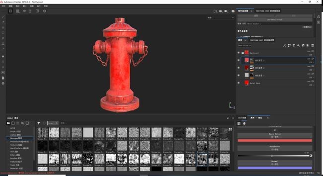 首先,打開一個官方樣本作為教學演示,把材質改為粗糙度金屬的 PBR 材質。並檢查該貼圖是否要全部烘培。然後創建一個智能材質作為底色,該材質只添加了邊緣磨損和使用 AO 算出來的陰影灰塵。