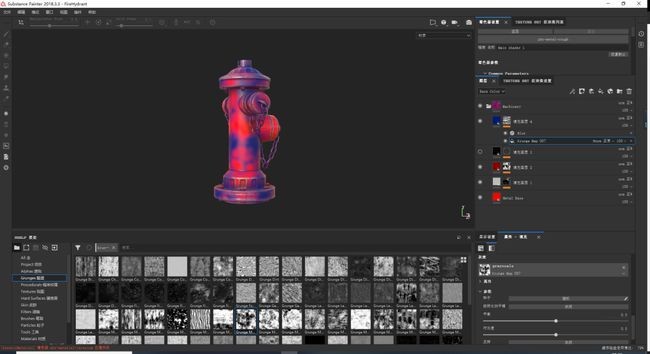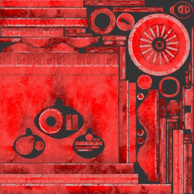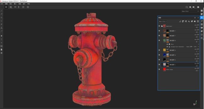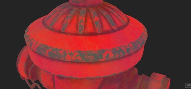 二,是髒汙貼圖疊加的升級版,該方法主要運用在模型貼圖上已有足夠細節且並不用做很久就可以使用的情況。首先新建一個圖層,添加圖層遮罩,再來不是保留髒汙貼圖,而是在該基礎上使用濾鏡,讓遮罩邊緣變得模糊不是很清晰,透過調整遮罩中的種子,隨機調整成自己想要的形狀。至於顏色可以隨意加,也可以調整圖層的疊加方式,總之找到自己覺得合適的程度,最後透過調整貼圖的透明度來控制顏色變化的虛實。以下是我疊加三個圖層後得到的效果。這個效果既不會使顏色變的很髒,又能夠表現出消防栓表面油漆的顏色變化,不會只是一層紅漆的效果。