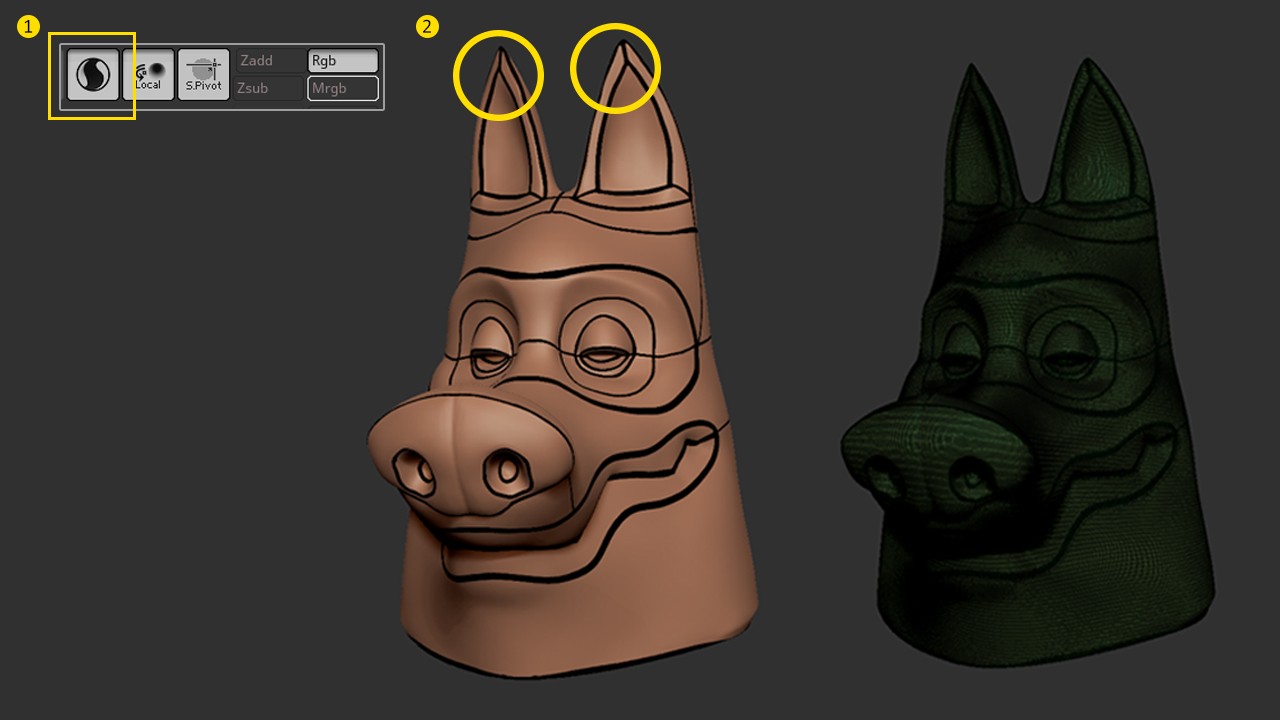 使用標準筆刷繪製你的模型,並確認有開啟「Sculptris Pro」(01)功能,為了讓耳朵尖尖(02)的角落能保持銳利,我將它分成 3 組 PolyGroup。當我決定按照「群組」或其它功能細緻化的話,讓耳朵的邊緣也依舊保持銳利。