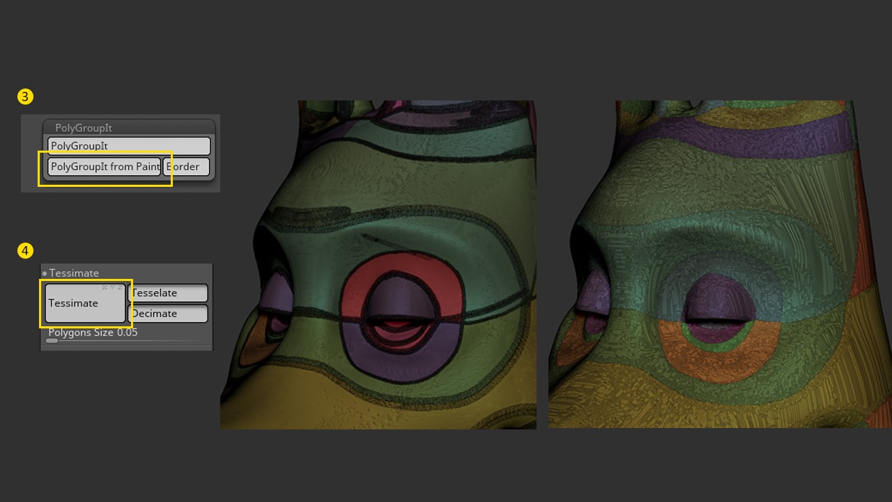 在 Zplugin 中開啟 PolyGroupIt 功能,並使用 PolyGroupIt from Paint(03) 來定義群組,然後使用