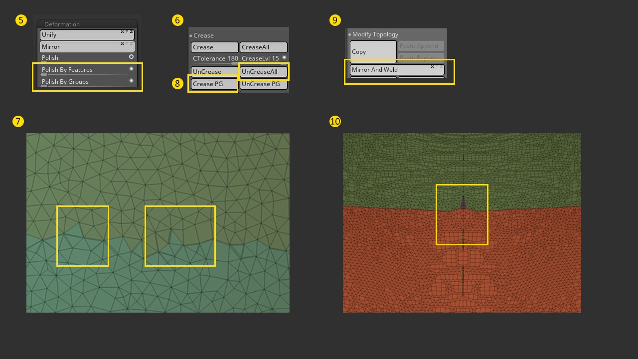 使用 Polish By Features 或是 Group(05) 幾次,然後透過 UnCreaseAll(06) 來除去模型上的最小摺痕(07),再用 Crease PG(08) 來增強 Polygroup 的邊緣,然後套用 Mirror And Weld(09) 將鏡射接縫的點焊起來除去中心線條。因為我們必須除去模型上那些小型獨立的 Polygroups(10)。所以按下「Crtl」+「Shift」並點擊兩個 Polygroups 的中線,然後按下「Ctrl」+「W」來確保它們成為同一個群組。