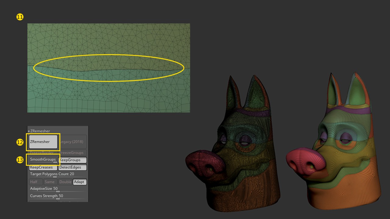 一旦模型清理完成後,應該會在所有的 Polygroups 的交界處看到許多摺痕(11)。接著,你可以按下 ZRemesher(12),注意,這裡我把 SmoothGroups(13) 設定為1,因為我要有較容易處理的高解析度模型。
