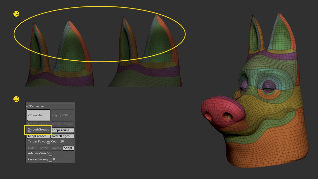 在第一次 ZRemesher 的過程,模型可能看起來不會太完美。請不用擔心,藉由遮罩、Polishingby Groups 以及 Smooth 筆刷(14) 來清理那些有問題的地方。按住 Shift 然後立即放開,來切換表面放鬆的演算法。